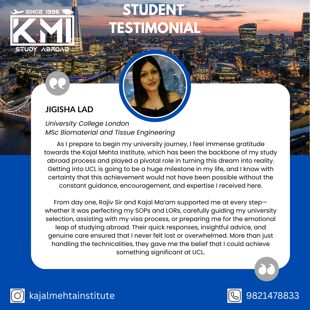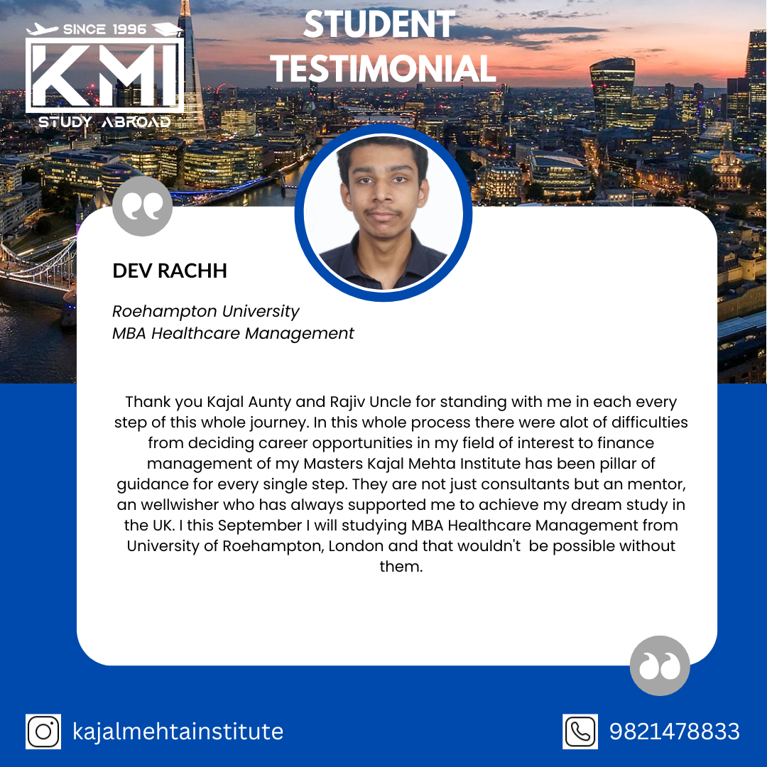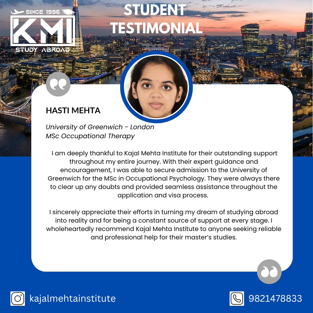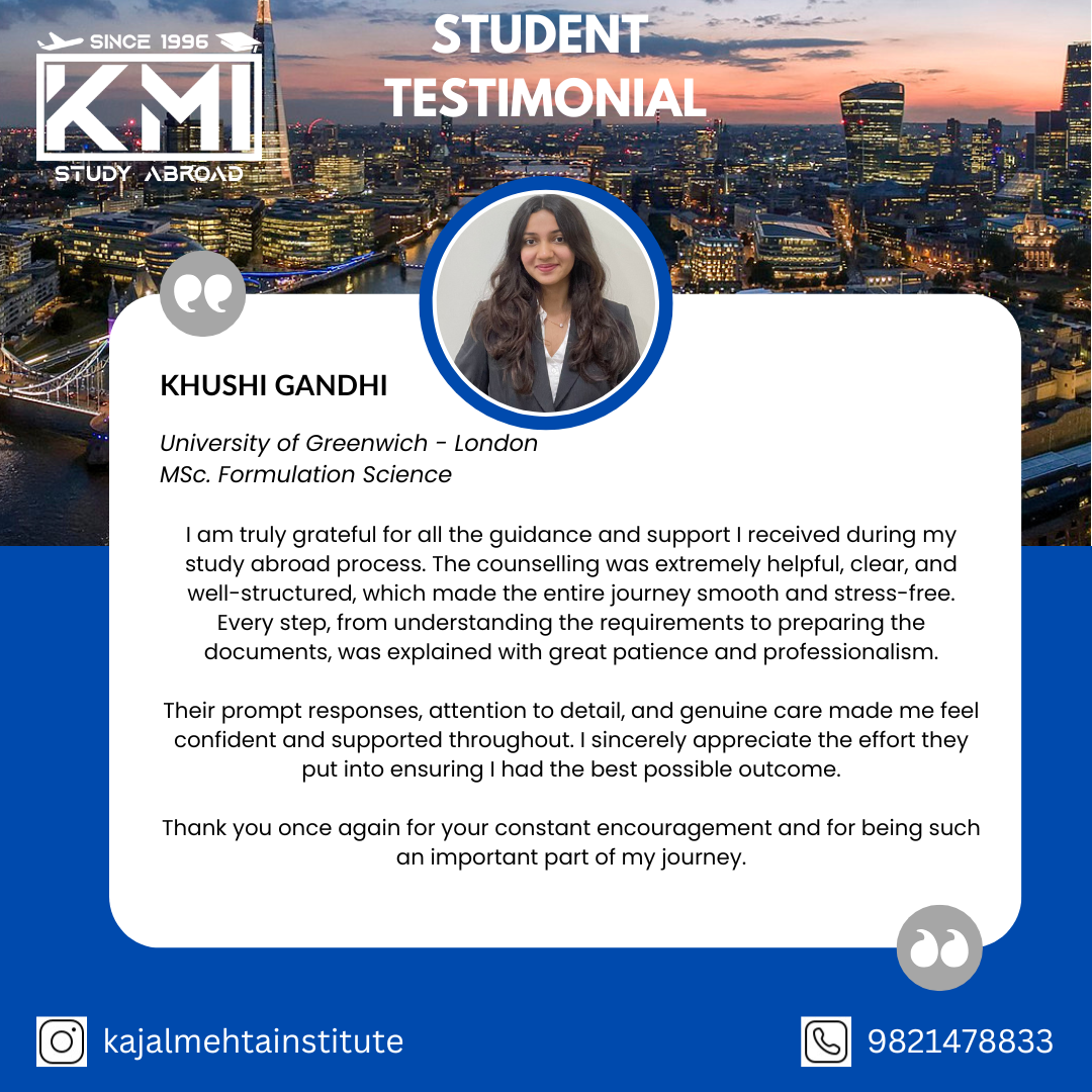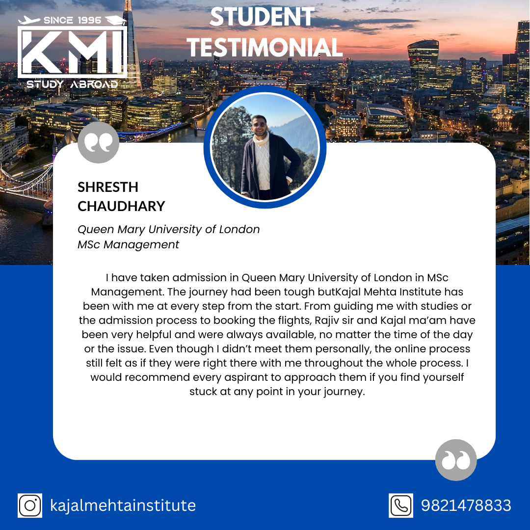 After considering each student's academic goals, professional ambitions, personal preferences, and budget constraints, KMI’s advisors help students navigate the complexities of choosing the ideal study destination by evaluating key factors such as the quality of education, research opportunities, cost of living, language, visa regulations, and post-study work options. This tailored approach guarantees that every student’s choice supports both their immediate learning objectives and long-term career development.